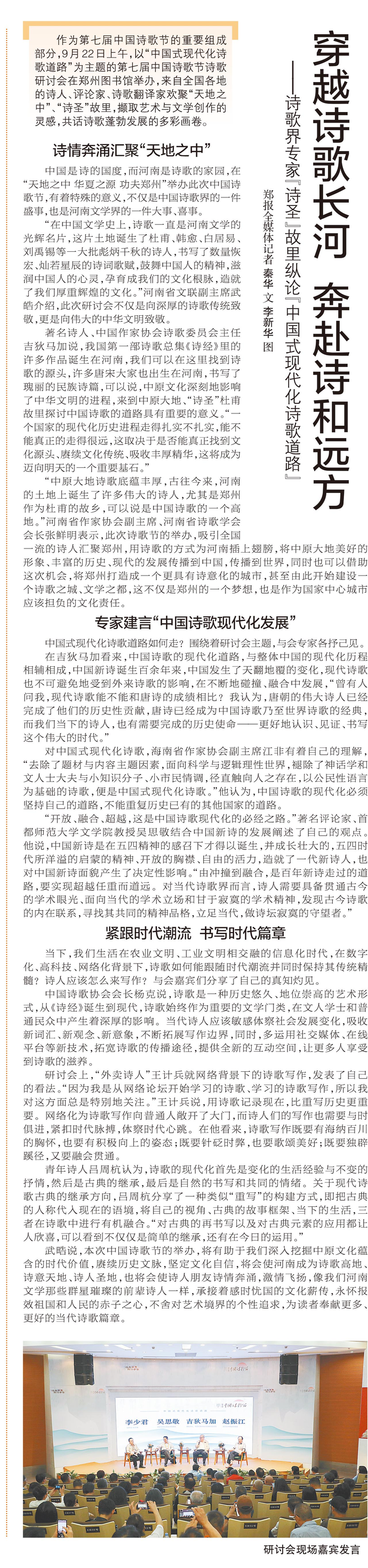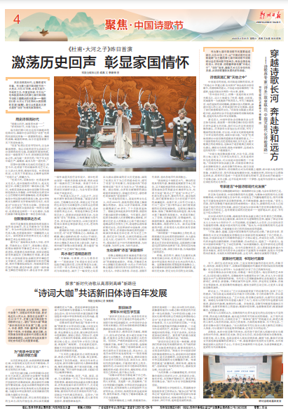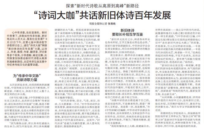 心中有诗意,处处皆清欢。新时代背景下,诗歌如何传承创新,更好地走向人民大众、服务社会发展?9月22日下午,在第七届中国诗歌节诗歌研讨会上,诸位“诗词大咖”围绕“新旧体诗的百年发展”主题,以诗人、学者、教授、作家、翻译家、评论家等多个视角,分享感触、阐述见解,共同探索加快推动新时代诗歌从高原到高峰新路径,共话传承弘扬发展中华优秀传统文化的重要命题。(今日《郑州日报》4版)