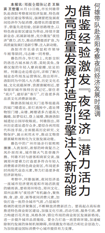 6月13日晚,市长何雄带队赴洛阳考察夜间经济发展、特色商业街区建设等情况,强调要把发展夜间经济作为促消费、稳增长的重要抓手,借鉴先进经验,创新思路理念,以特色商业街区建设为带动,持续丰富新业态、拓展新场景,充分激发“夜经济”潜力、活力,推动消费提质扩容,为高质量发展打造新引擎、注入新动能。