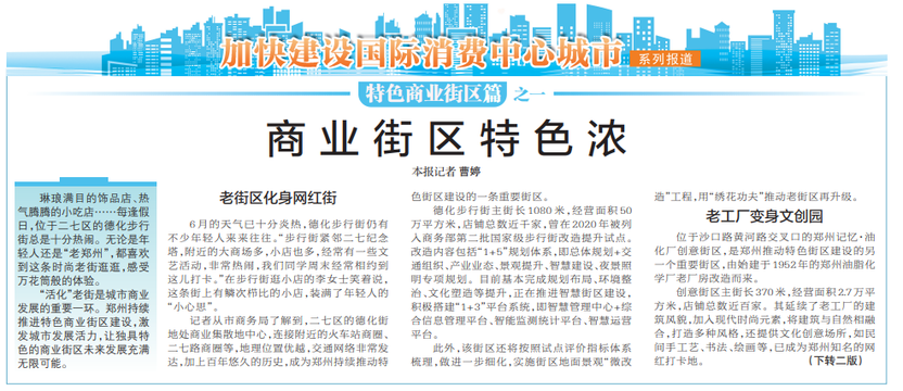 “活化”老街是城市商业发展的重要一环。郑州持续推进特色商业街区建设,激发城市发展活力,让独具特色的商业街区未来发展充满无限可能。(今日《郑州日报》1版、2版)