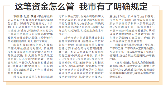 事业单位科研人员职务科技成果转化现金奖励怎么管?郑州有了明确规定。6月13日,记者从郑州市科技局获悉,市人社局、财政局、科技局共同印发《关于事业单位科研人员职务科技成果转化现金奖励纳入绩效工资管理有关问题的通知》,对此进行了规定。(今日《郑州日报》2版)