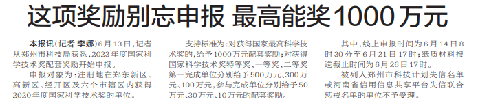 6月13日,记者从郑州市科技局获悉,2023年度国家科学技术奖配套奖励开始申报。(今日《郑州日报》2版)