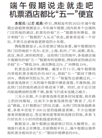 昨日,携程发布的2023年端午假期出游趋势预测显示,今年端午假期,国内和多个出境热门目的地的酒店、机票均价较“五一”假期有所降低。预计相较“五一”假期的“人从众”状态,游客将迎来一个好玩、不贵且出游体验更舒适的小长假。(今日《郑州日报》2版)