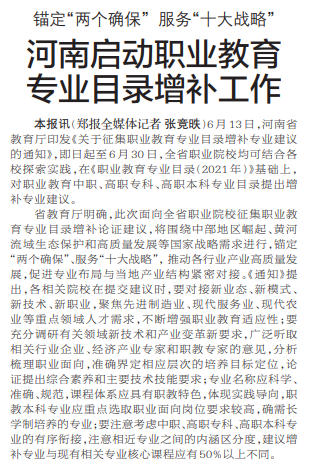 6月13日,河南省教育厅印发《关于征集职业教育专业目录增补专业建议的通知》,即日起至6月30日,全省职业院校均可结合各校探索实践,在《职业教育专业目录(2021年)》基础上,对职业教育中职、高职专科、高职本科专业目录提出增补专业建议。(今日《郑州日报》8版)