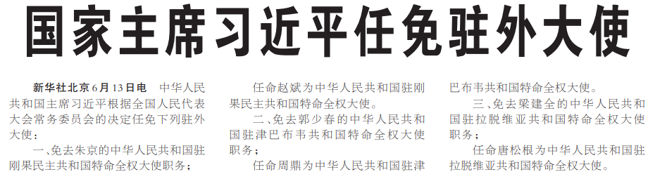 中华人民共和国主席习近平根据全国人民代表大会常务委员会的决定任免下列驻外大使。(今日《人民日报》1版)