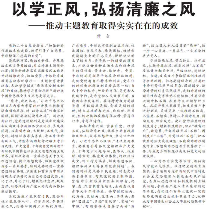 清风润万家,廉韵启新程。开展廉洁文化宣传月活动,举办清廉主题演讲比赛;围绕新时期家庭家教家风工作召开现场推进会,组织党员、干部赴廉政教育基地参观学习……主题教育开展以来,各地紧紧锚定“廉洁奉公树立新风”的目标,推动学习贯彻习近平新时代中国特色社会主义思想走深走实。(今日《人民日报》1版)