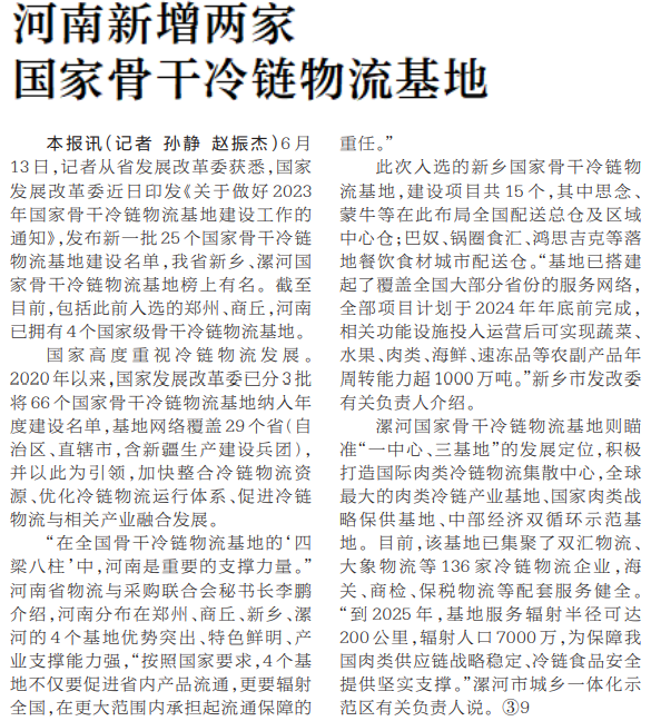 6月13日,记者从省发展改革委获悉,国家发展改革委近日印发《关于做好2023年国家骨干冷链物流基地建设工作的通知》,发布新一批25个国家骨干冷链物流基地建设名单,我省新乡、漯河国家骨干冷链物流基地榜上有名。截至目前,包括此前入选的郑州、商丘,河南已拥有4个国家级骨干冷链物流基地。(今日《河南日报》1版)