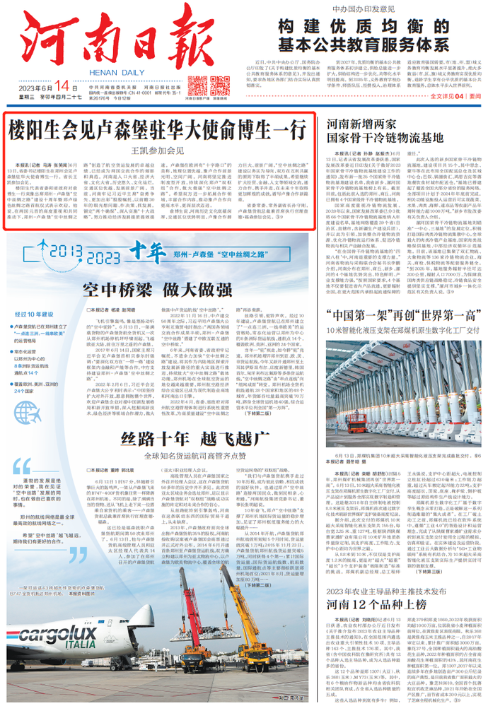 楼阳生代表省委和省政府对俞博生一行来豫出席郑州-卢森堡“空中丝绸之路”建设十周年暨郑卢绿色丝绸之路首航仪式表示欢迎。(今日《河南日报》1版)