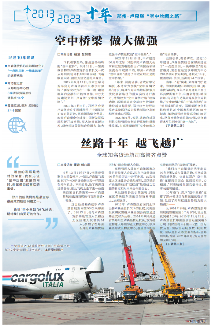 六年前的今天,习近平总书记会见卢森堡首相贝泰尔时指出,支持建设郑州—卢森堡“空中丝绸之路”,六年来,这条“空中丝路”已在国际航空货运都市圈内持续壮大,越飞越高。