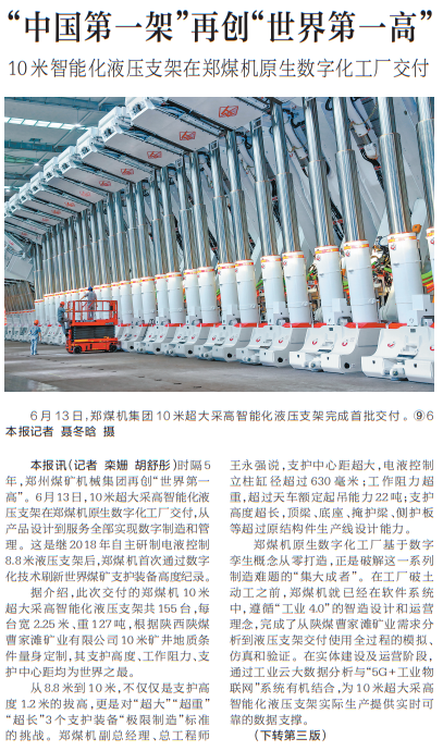 时隔5年,郑州煤矿机械集团再创“世界第一高”。6月13日,10米超大采高智能化液压支架在郑煤机原生数字化工厂交付,从产品设计到服务全部实现数字制造和管理。这是继2018年自主研制电液控制8.8米液压支架后,郑煤机首次通过数字化技术刷新世界煤矿支护装备高度纪录。(今日《河南日报》1版、3版)
