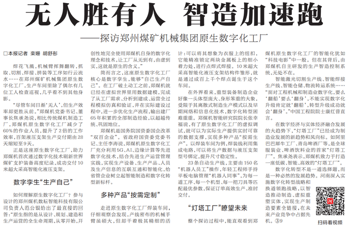 正是这座原生数字化工厂,助力郑煤机首次通过数字化技术刷新世界煤矿支护装备高度纪录,成功交付10米超大采高智能化液压支架。(今日《河南日报》2版)