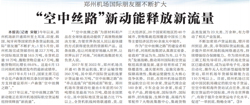 来自河南省机场集团最新统计数据显示:六年来,郑州机场新开41条货运航线,扩大了国际“粉丝圈”,累计运输的货物总量达到350万吨。持续扩大的“朋友圈”折射出郑州高质量推进“空中丝绸之路”建设取得的丰硕成果,实现“空中丝绸之路”由“串点连线”向“组网成面”转变,“空中丝绸之路”载体功能正在加速持续放大。(今日《郑州日报》2版)