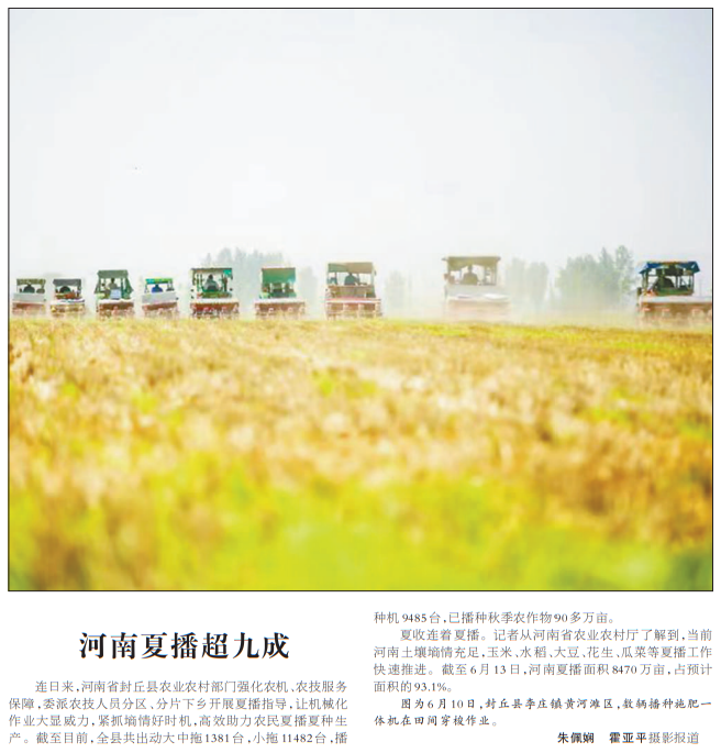 夏收连着夏播。记者从河南省农业农村厅了解到,当前河南土壤墒情充足,玉米、水稻、大豆、花生、瓜菜等夏播工作快速推进。截至6月13日,河南夏播面积8470万亩,占预计面积的93.1%。(今日《人民日报》2版)