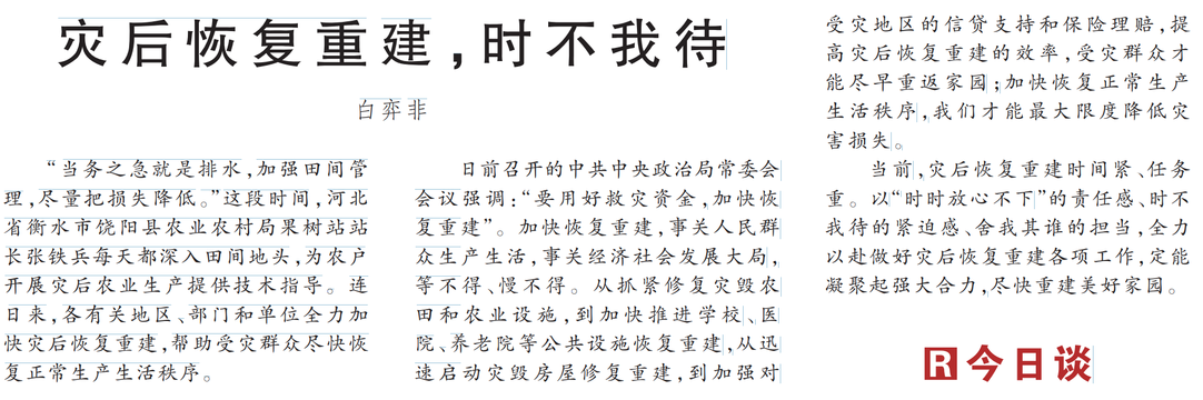 “当务之急就是排水,加强田间管理,尽量把损失降低。”这段时间,河北省衡水市饶阳县农业农村局果树站站长张铁兵每天都深入田间地头,为农户开展灾后农业生产提供技术指导。连日来,各有关地区、部门和单位全力加快灾后恢复重建,帮助受灾群众尽快恢复正常生产生活秩序。(今日《人民日报》1版)