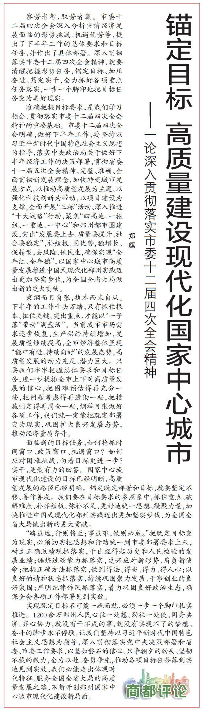 察势者智,驭势者赢。市委十二届四次全会深入分析当前经济发展面临的形势挑战、机遇优势等,提出了下半年工作的总体要求和目标任务,并作出了具体部署。深入贯彻落实市委十二届四次全会精神,就要清醒把握形势任务,锚定目标、加压奋进、笃定实干,全力抓好各项重点任务落实,一步一个脚印地把目标任务变为美好现实。(今日《郑州日报》1版)