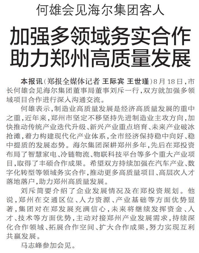 8月18日,市长何雄会见海尔集团董事局董事刘斥一行,双方就加强多领域项目合作进行深入沟通交流。(今日《郑州日报》1版)