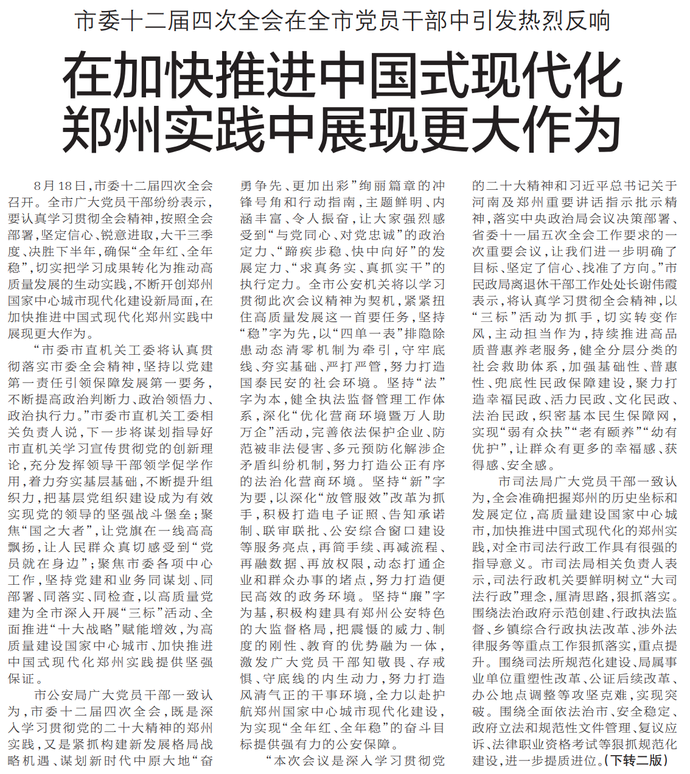 8月18日,市委十二届四次全会召开。全市广大党员干部纷纷表示,要认真学习贯彻全会精神,按照全会部署,坚定信心、锐意进取,大干三季度、决胜下半年,确保“全年红、全年稳”,切实把学习成果转化为推动高质量发展的生动实践,不断开创郑州国家中心城市现代化建设新局面,在加快推进中国式现代化郑州实践中展现更大作为。(今日《郑州日报》1版、2版)