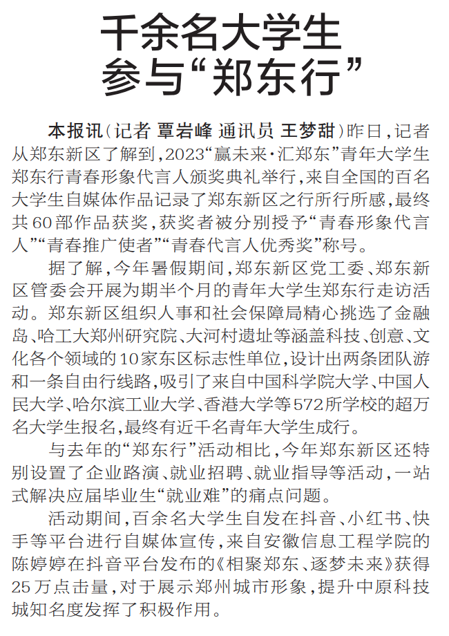 昨日,记者从郑东新区了解到,2023“赢未来·汇郑东”青年大学生郑东行青春形象代言人颁奖典礼举行,来自全国的百名大学生自媒体作品记录了郑东新区之行所行所感,最终共60部作品获奖,获奖者被分别授予“青春形象代言人”“青春推广使者”“青春代言人优秀奖”称号。(今日《郑州日报》2版)