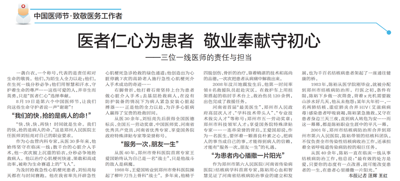 一袭白衣,一个称号,代表的是责任和对生命的敬畏。他们,为陌生人全力以赴;他们,在生死一线分秒必争;他们用智慧和汗水,守护着生命的尊严……这些可爱的人,并非生而英勇,只是“医者仁心”选择奉献。(今日《郑州日报》2版)