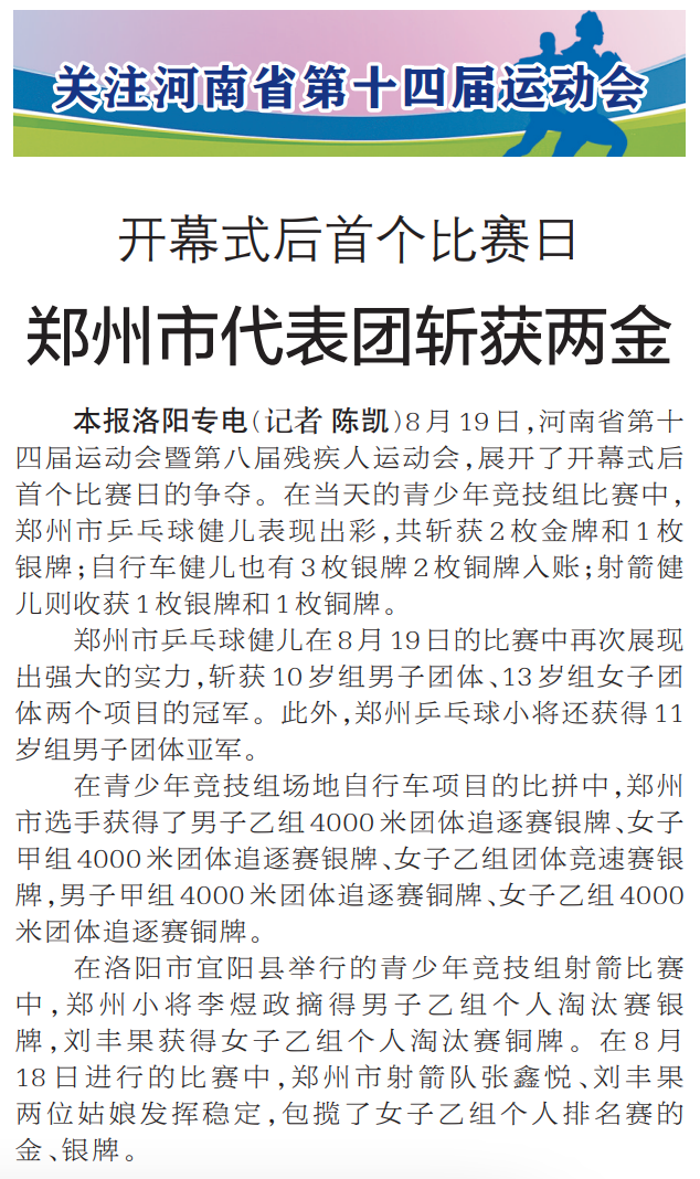 8月19日,河南省第十四届运动会暨第八届残疾人运动会,展开了开幕式后首个比赛日的争夺。在当天的青少年竞技组比赛中,郑州市乒乓球健儿表现出彩,共斩获2枚金牌和1枚银牌;自行车健儿也有3枚银牌2枚铜牌入账;射箭健儿则收获1枚银牌和1枚铜牌。(今日《郑州日报》2版)