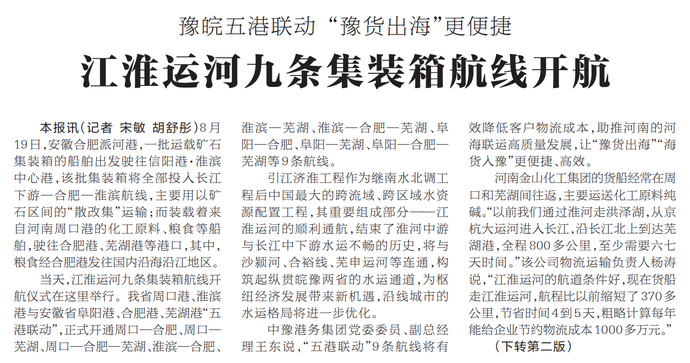 8月19日,安徽合肥派河港,一批运载矿石集装箱的船舶出发驶往信阳港·淮滨中心港,该批集装箱将全部投入长江下游—合肥—淮滨航线,主要用以矿石区间的“散改集”运输;而装载着来自河南周口港的化工原料、粮食等船舶,驶往合肥港、芜湖港等港口,其中,粮食经合肥港发往国内沿海沿江地区。(今日《河南日报》1版、2版)