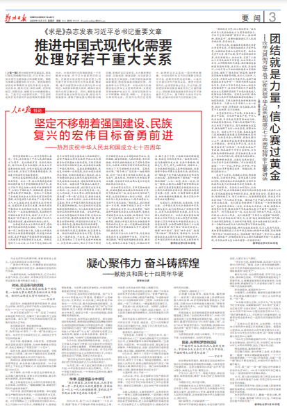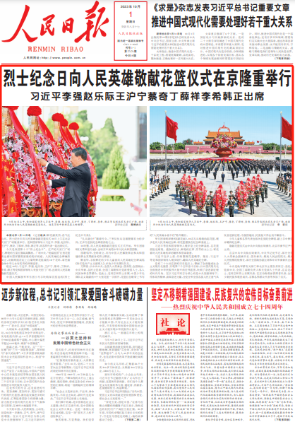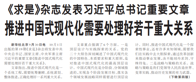 10月1日出版的第19期《求是》杂志将发表中共中央总书记、国家主席、中央军委主席习近平的重要文章《推进中国式现代化需要处理好若干重大关系》。(今日《人民日报》1版、4版)