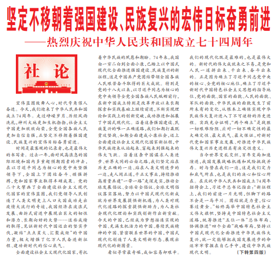 宏伟蓝图鼓舞人心,时代号角催人奋进。今天,我们迎来了中华人民共和国成立74周年。走过峥嵘岁月、历经风雨洗礼,神州大地更加生机勃勃,社会主义中国更加欣欣向荣,全党全国各族人民更加自信自强,正坚定不移朝着强国建设、民族复兴的宏伟目标奋勇前进。(今日《人民日报》1版、4版)