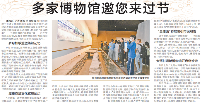 郑州纺织工业遗址博物馆临时体验区免费开放;市民走进郑州商都遗址博物院体验全国首个商文化主题沉浸式互动剧场;精彩的“金风拂面”——书院街墓地“金覆面”展……这个中秋国庆长假,绿城多家博物馆纷纷推出精彩纷呈的文博活动,吸引众多市民沉浸其中。(今日《郑州日报》2版)