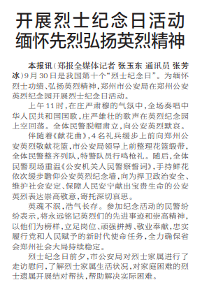 9月30日是我国第十个“烈士纪念日”。为缅怀烈士功绩、弘扬英烈精神,郑州市公安局在郑州公安英烈纪念园开展烈士纪念日活动。(今日《郑州日报》2版)