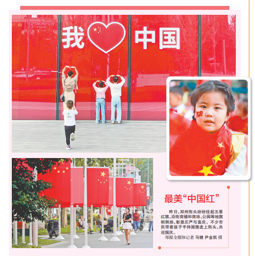 昨日,郑州街头纷纷挂起五星红旗,沿街商铺和商场、公园等地旗帜飘扬,彰显庄严与喜庆。不少市民带着孩子手持国旗走上街头,共迎国庆。(今日《郑州日报》2版)