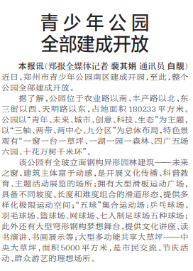 近日,郑州市青少年公园南区建成开园,至此,整个公园全部建成开放。(今日《郑州日报》2版)