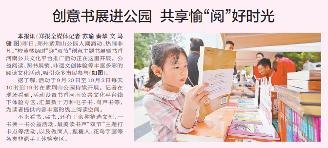 昨日,郑州紫荆山公园人潮涌动、热闹非凡。“橙黄橘绿时”迎“双节”创意主题书展暨书香河南公共文化平台推广活动正在这里开展。公益阅读、图书展销、非遗文创体验等丰富多彩的阅读文化活动,吸引众多市民参与。(今日《郑州日报》2版)