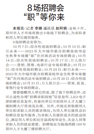 金秋十月,郑州市人才市场将推出8场线下招聘会,为求职者和用人单位提供服务。(今日《郑州日报》2版)