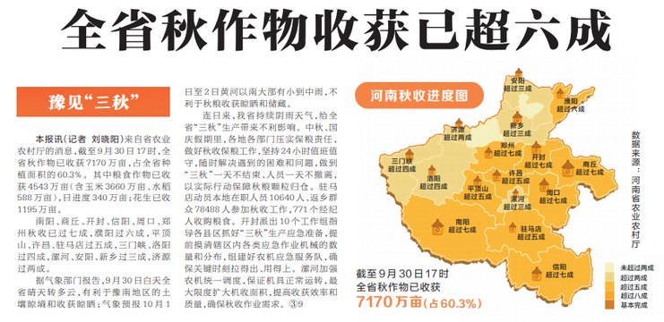 来自省农业农村厅的消息,截至9月30日17时,全省秋作物已收获7170万亩,占全省种植面积的60.3%。其中粮食作物已收获4543万亩(含玉米3660万亩、水稻588万亩),日进度340万亩;花生已收1195万亩。(今日《河南日报》1版)
