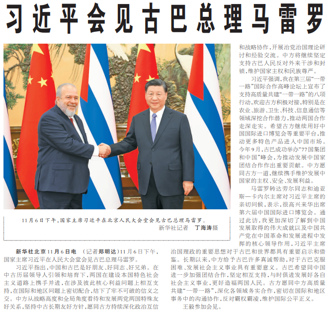 11月6日下午,国家主席习近平在人民大会堂会见古巴总理马雷罗。(今日《人民日报》1版)