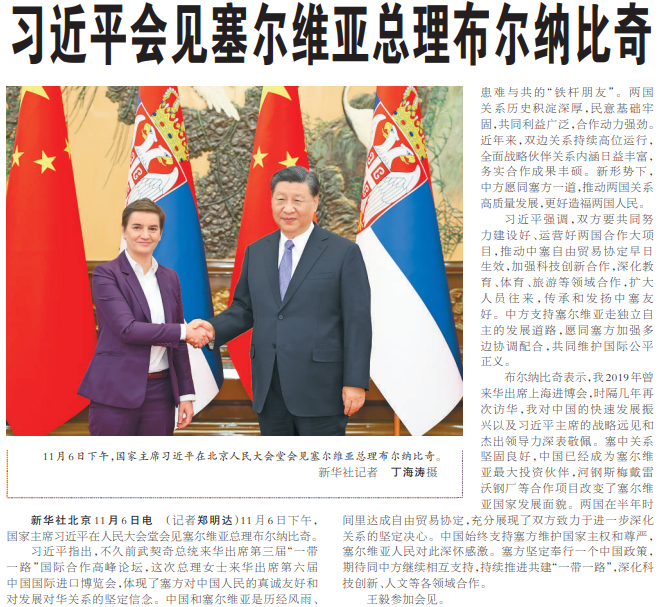 11月6日下午,国家主席习近平在人民大会堂会见塞尔维亚总理布尔纳比奇。(今日《人民日报》1版)