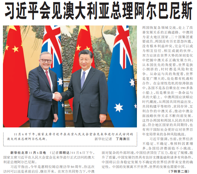 11月6日下午,国家主席习近平在人民大会堂会见来华进行正式访问的澳大利亚总理阿尔巴尼斯。(今日《人民日报》1版、2版)