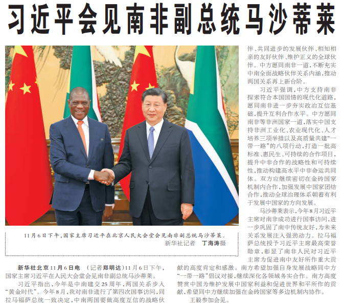 11月6日下午,国家主席习近平在人民大会堂会见南非副总统马沙蒂莱。(今日《人民日报》1版)