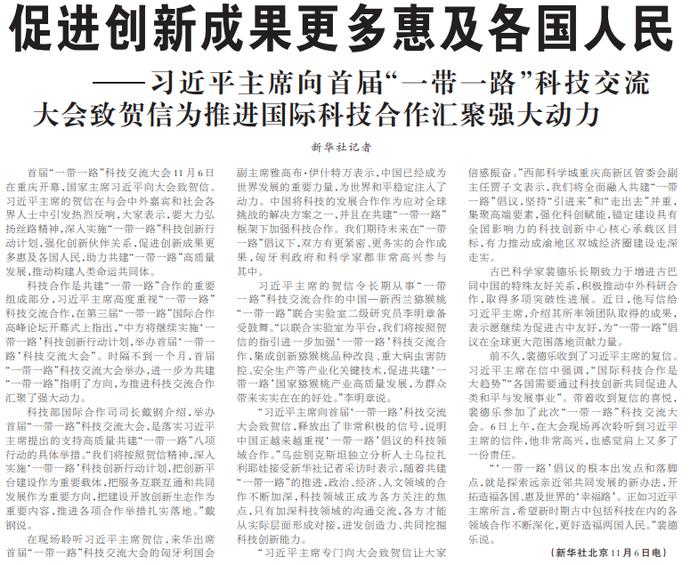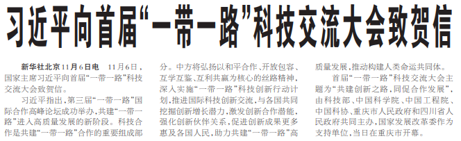 11月6日,国家主席习近平向首届“一带一路”科技交流大会致贺信。(今日《人民日报》1版)