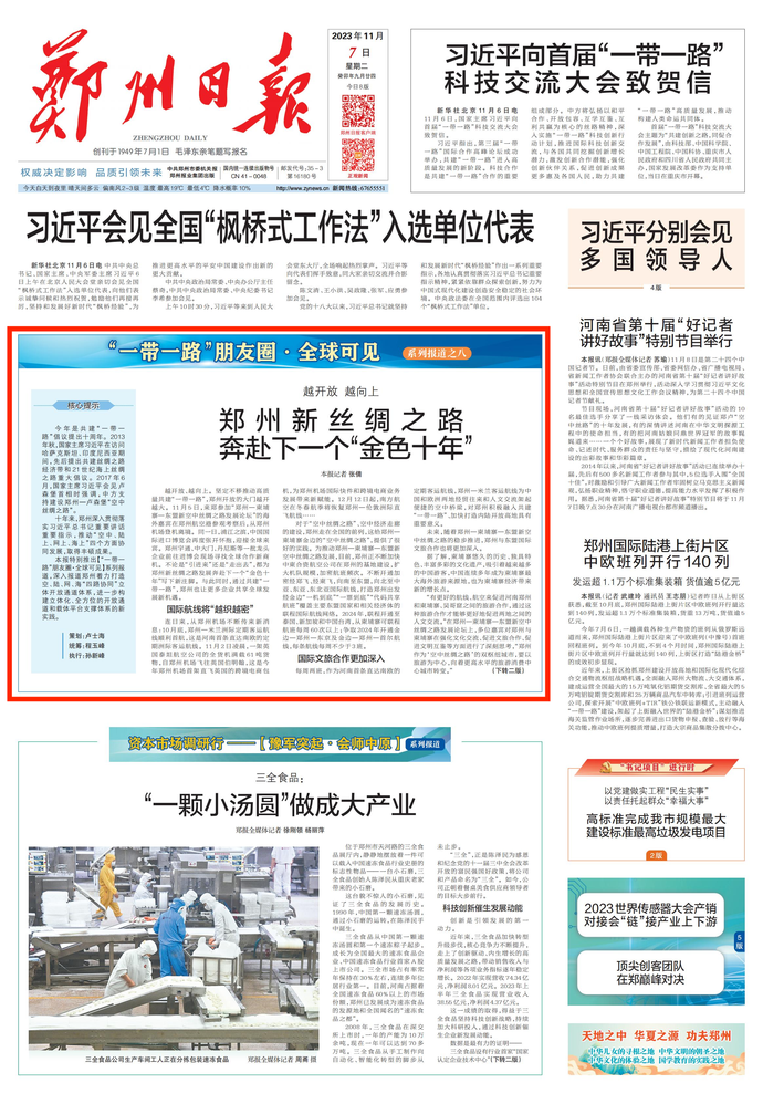 越开放、越向上。坚定不移推动高质量共建“一带一路”,郑州开放的大门越开越大。11月5日,来郑参加“郑州—柬埔寨—东盟新空中丝绸之路发展论坛”的海外嘉宾在郑州航空港参观考察后,从郑州机场登机离境。同一日,浦江之滨,中国国际进口博览会再度张开怀抱,迎接全球来宾。郑州宇通、中大门、丹尼斯等一批龙头企业前往进博会现场寻找全球合作新商机。不论是“引进来”还是“走出去”,都为郑州新丝绸之路发展奔赴下一个“金色十年”写下新注脚。与此同时,通过共建“一带一路”,郑州也让更多企业共享全球发展新机遇。(今日《郑州日报》1版、2版)
