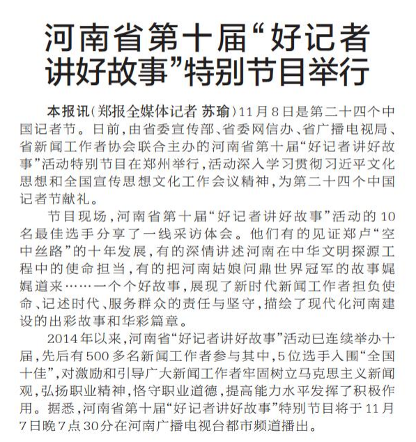 11月8日是第二十四个中国记者节。日前,由省委宣传部、省委网信办、省广播电视局、省新闻工作者协会联合主办的河南省第十届“好记者讲好故事”活动特别节目在郑州举行,活动深入学习贯彻习近平文化思想和全国宣传思想文化工作会议精神,为第二十四个中国记者节献礼。(今日《郑州日报》1版)