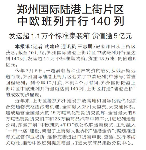 记者昨日从上街区获悉,截至10月底,郑州国际陆港上街片区中欧班列开行量达到140列,发运超1.1万个标准集装箱,货重13万吨,货值逾5亿元。(今日《郑州日报》1版)