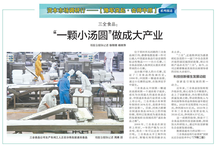 位于郑州市天河路的三全食品展厅内,静静地摆放着一件可以载入中国速冻食品行业史册的标志性物品——一台小石磨,三全食品创始人陈泽民从重庆老家带来的小石磨。(今日《郑州日报》1版、2版)