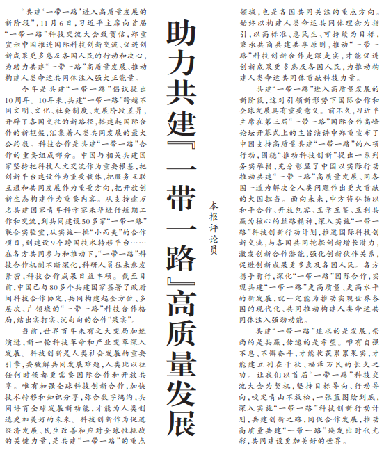 “共建‘一带一路’进入高质量发展的新阶段”,11月6日,习近平主席向首届“一带一路”科技交流大会致贺信,郑重宣示中国推进国际科技创新交流、促进创新成果更多惠及各国人民的行动和决心,为助力共建“一带一路”高质量发展、推动构建人类命运共同体注入强大正能量。(今日《人民日报》2版)