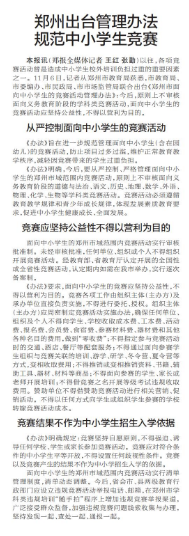 以往,各项竞赛活动曾是造成中小学生校外培训负担过重的重要因素之一。11月6日,记者从郑州市教育局获悉,市教育局、市委编办、市民政局、市市场监管局联合出台《郑州市面向中小学生的竞赛活动管理办法》:今后,原则上不审核面向义务教育阶段的学科类竞赛活动,面向中小学生的竞赛活动应坚持公益性,不得以营利为目的。(今日《郑州日报》2版)