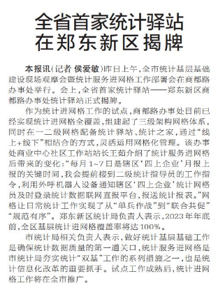 昨日上午,全市统计基层基础建设现场观摩会暨统计服务进网格工作部署会在商都路办事处举行。会上,全省首家统计驿站——郑东新区商都路办事处统计驿站正式揭牌。(今日《郑州日报》2版)