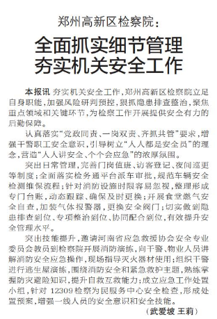 本报讯 夯实机关安全工作,郑州高新区检察院立足自身职能,加强风险研判预控,狠抓隐患排查整治,聚焦重点领域和关键环节,为检察工作开展提供安全有力的后勤保障。(今日《郑州日报》2版)