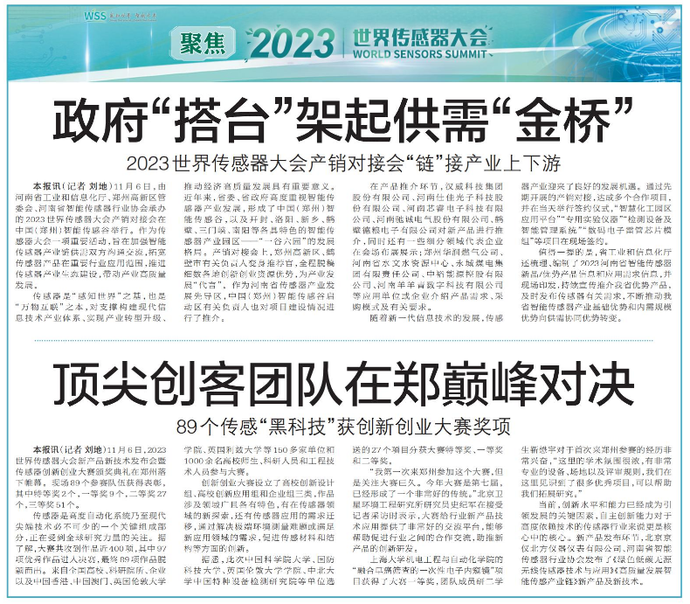 11月6日,由河南省工业和信息化厅、郑州高新区管委会、河南省智能传感器行业协会承办的2023世界传感器大会产销对接会在中国(郑州)智能传感谷举行。作为传感器大会一项重要活动,旨在加强智能传感器产业链供需双方沟通交流,拓宽传感器产品在重要行业应用范围,推进传感器产业生态建设,带动产业高质量发展。(今日《郑州日报》5版)