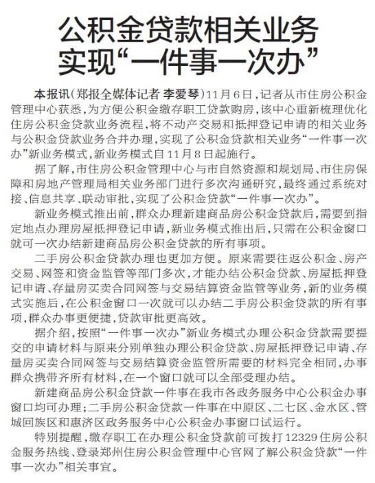 11月6日,记者从市住房公积金管理中心获悉,为方便公积金缴存职工贷款购房,该中心重新梳理优化住房公积金贷款业务流程,将不动产交易和抵押登记申请的相关业务与公积金贷款业务合并办理,实现了公积金贷款相关业务“一件事一次办”新业务模式,新业务模式自11月8日起施行。(今日《郑州日报》5版)