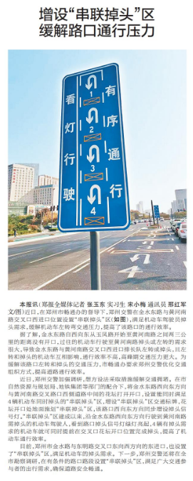 近日,在郑州市畅通办的督导下,郑州交警在金水东路与黄河南路交叉口西进口位置设置“串联掉头”区,满足机动车驾驶员掉头需求,缓解机动车左转弯交通压力,提高了该路口的通行效率。(今日《郑州日报》5版)