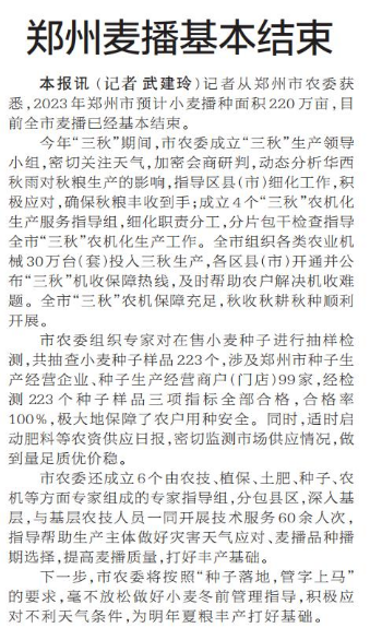 记者从郑州市农委获悉,2023年郑州市预计小麦播种面积220万亩,目前全市麦播已经基本结束。(今日《郑州日报》6版)
